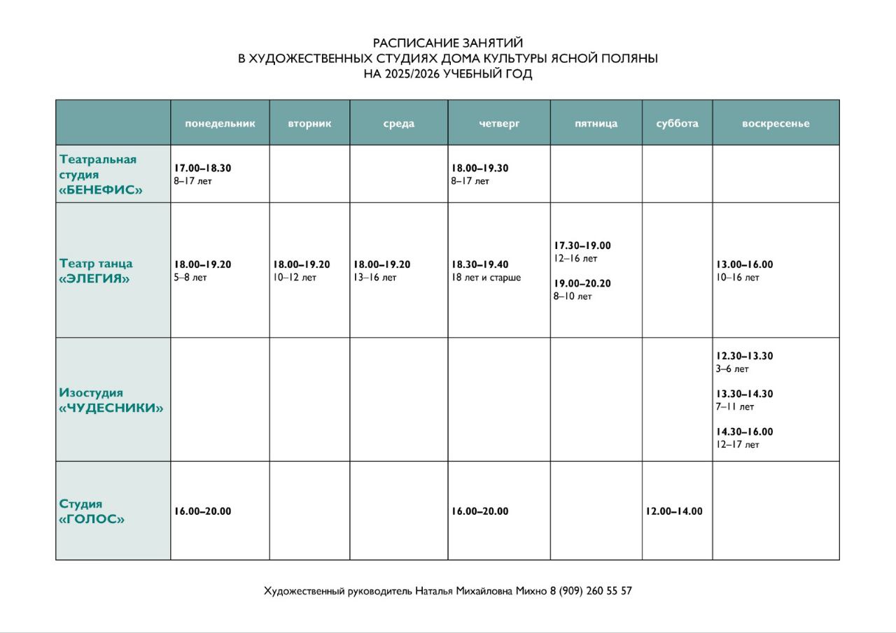 Дом культуры «Ясная Поляна» приглашает взрослых и детей в художественные студии. Занятия групповые и индивидуальные. Художественный руководитель Дома культуры – Наталья Михайловна Михно nata.mikhno@gmail.com, 8 909 260 55 57.